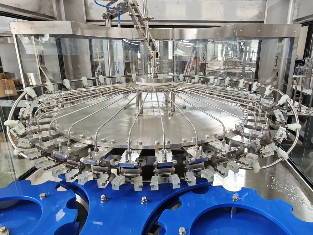 The bottle is transmitted by the air conveyor and sent to the rinser of the three-in-one machine through the bottle star wheel. The bottle clamp is installed on the rotating disk of the rinser. The bottle clamp clamps the bottle mouth and turns 180° along the guide rail to make the bottle mouth face down. In the specific area of the rinser, the rinser nozzle sprays rinsing water to rinse the inner wall of the bottle. After rinsing and draining, the bottle is clamped by the bottle clamp and turned 180° along the guide rail to make the bottle mouth face up. The washed bottle is guided out of the rinser through the bottle star wheel and sent to the filling machine. The bottle entering the filling machine is clamped by the bottleneck clamp installed on this lifting device. The bottle mouth rises under the action of the cam and contacts the filling valve, and then the filling valve is pushed open by the bottle mouth. The filling adopts the method of micro-negative pressure and gravity filling. After the filling valve is opened, the material passes through the filling valve to complete the filling process. After the filling is completed, the bottle mouth leaves the filling valve under the action of the downward pressure cam, and the bottle enters the capping machine through the bottleneck transition dial. The anti-rotation knife on the capping machine clamps the bottleneck part to keep the bottle upright and prevent rotation. The capping head keeps orbiting and rotating on the capping machine, and realizes the actions of grabbing, covering, screwing and removing the cap under the action of the cam to complete the entire capping process. The finished bottle is transferred from the capping machine to the bottle conveyor chain through the bottle discharge dial, and is conveyed out of the three-in-one machine by the conveyor chain.